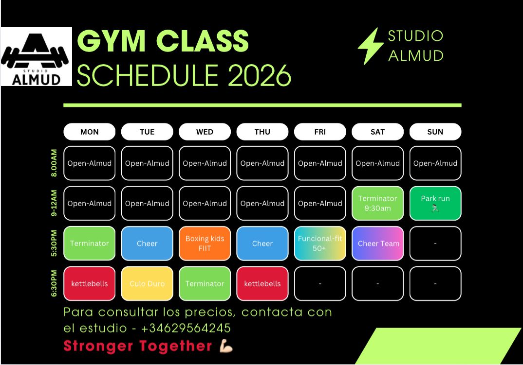 El estudio cuenta con una agenda de actividades variada y organizada, donde se imparten clases con el Método Terminator y otras disciplinas como Culo Duro (GAP), Kettlebells, Boxeo Infantil y Entrenamiento Funcional 50+. Además, Studio Almud desarrolla Easter Camps y Summer Camps para niñ@s, ampliando su oferta deportiva y educativa. Todas las actividades se realizan en un entorno cercano, profesional y orientado a crear una verdadera comunidad de entrenamiento.